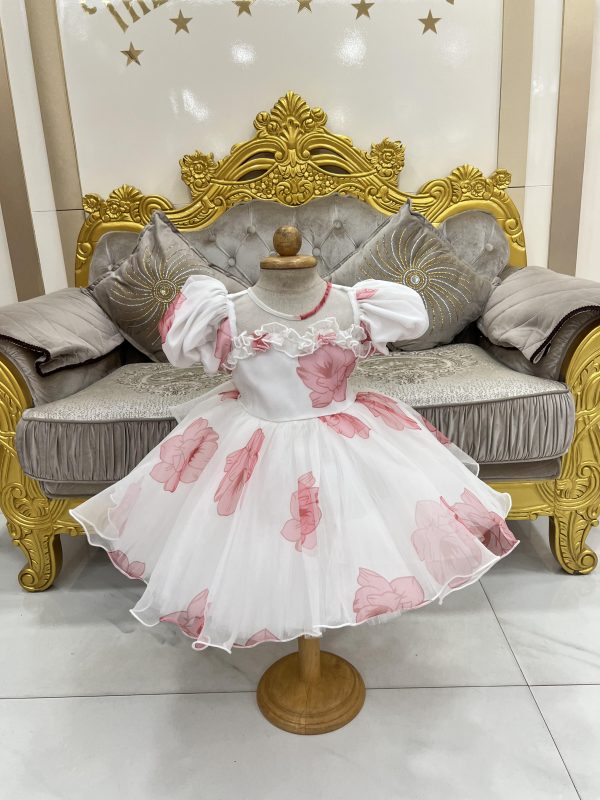 White organza dress adorned with soft pink floral prints—light, airy, and angelic.